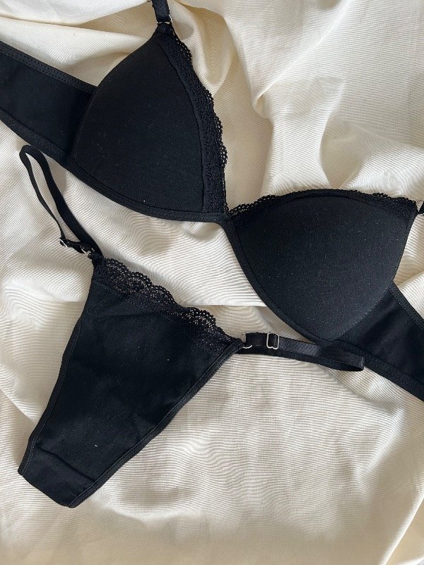 Conjunto con tela algodon con puntilla taza soft Breteles regulables (no desmontables) y bombi less con misma combinación de telas que el corpińo