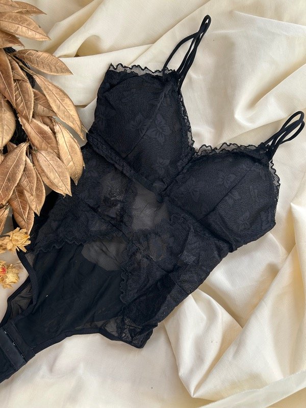 Body vededtina de micro tul con encaje elástizado. Cuenta con avíos metálicos y ajuste en parte baja con gancho de 3 posiciones. El corpiño tiene incorporado taza blanda.La espalda es abierta.